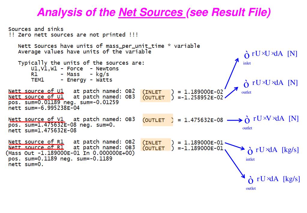 Net Source of U1 - is the momentum flux evaluated at the objects (INLET & OUTLET) • It means 1.189E-02 N flows thru the inlet and -1.2589E-02 N exit by the outlet. • The momentum imbalance is not necessarily equal to the momentum net sum. • Usually sources like momentum inside the domain such as blockages and also the pressure forces are not displayed on RESULT file (unfortunately).