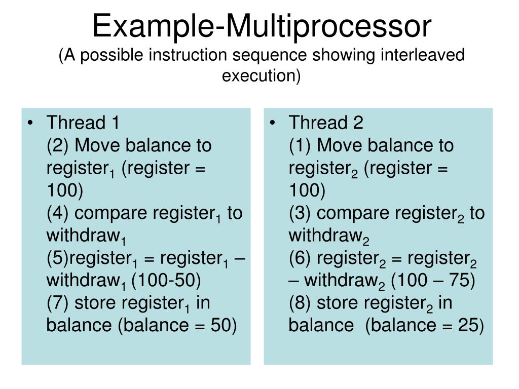 Thread 1(2) Move balance to register1 (register = 100)(4) compare register1 towithdraw1(5)register1 = register1 – withdraw1 (100-50)(7) store register1 in balance (balance = 50) Thread 2(1) Move balance to register2 (register = 100)(3) compare register2 to withdraw2(6) register2 = register2 – withdraw2 (100 – 75)(8) store register2 in balance (balance = 25) Example-Multiprocessor(A possible instruction sequence showing interleaved execution)