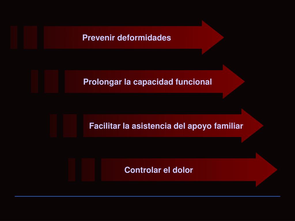 Prevenir deformidades Prolongar la capacidad funcional Facilitar la asistencia del apoyo familiar Controlar el dolor