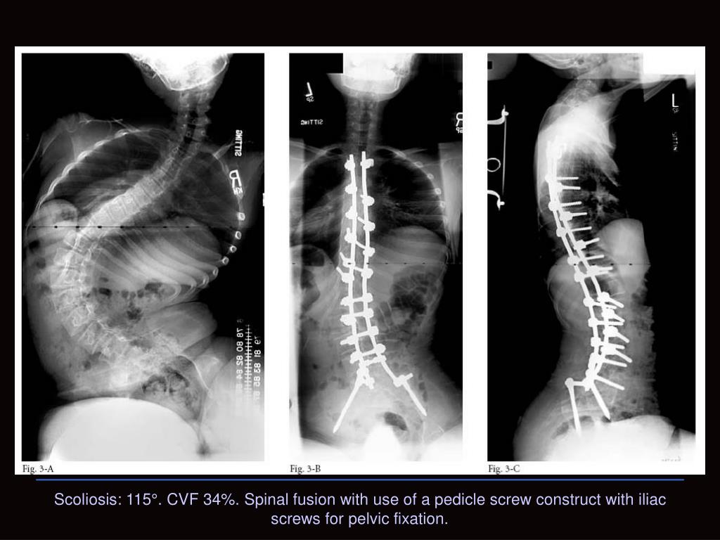 Scoliosis: 115°. CVF 34%. Spinal fusion with use of a pedicle screw construct with iliac screws for pelvic fixation.