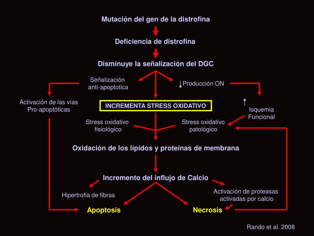 Mutación del gen de la distrofina Deficiencia de distrofina Disminuye la señalización del DGC Señalización anti-apoptotica Producción ON Activación de las vías Pro-apoptóticas INCREMENTA STRESS OXIDATIVO Isquemia Funcional Stress oxidativo fisiológico Stress oxidativo patológico Oxidación de los lípidos y proteínas de membrana Incremento del influjo de Calcio Hipertrofia de fibras Activación de proteasas activadas por calcio Apoptosis Necrosis Rando et al. 2008