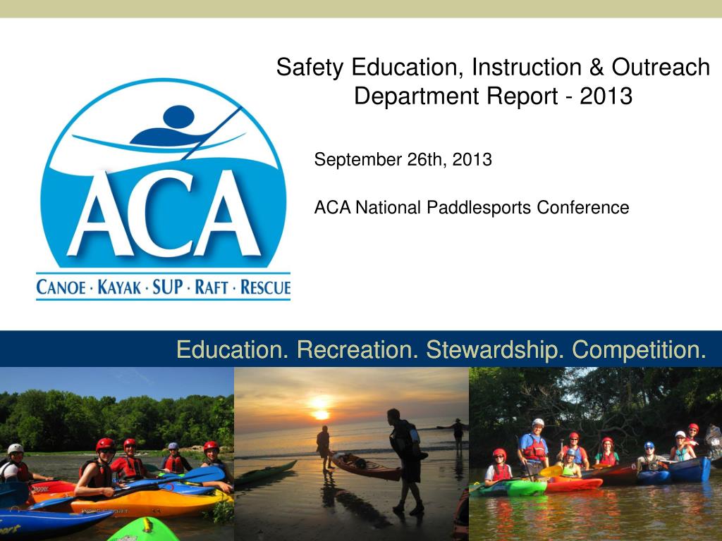Safety Education, Instruction & Outreach Department Report - 2013 September 26th, 2013 ACA National Paddlesports Conference Education. Recreation. Stewardship. Competition.
