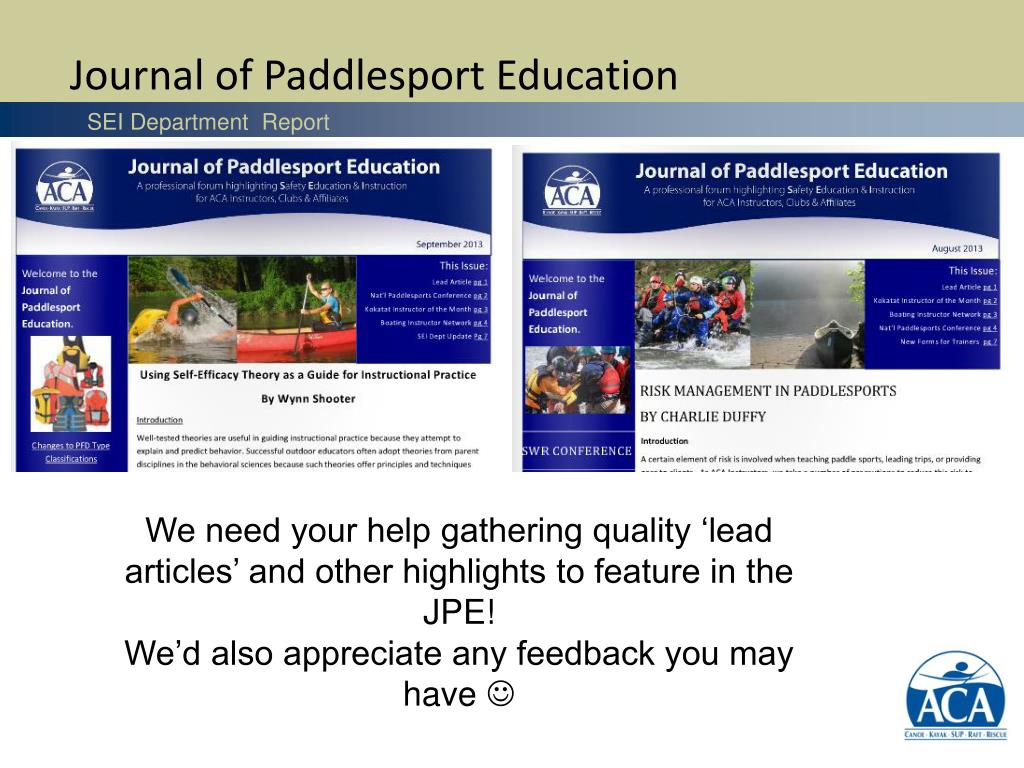 Journal of Paddlesport Education SEI Department Report We need your help gathering quality ‘lead articles’ and other highlights to feature in the JPE! We’d also appreciate any feedback you may have
