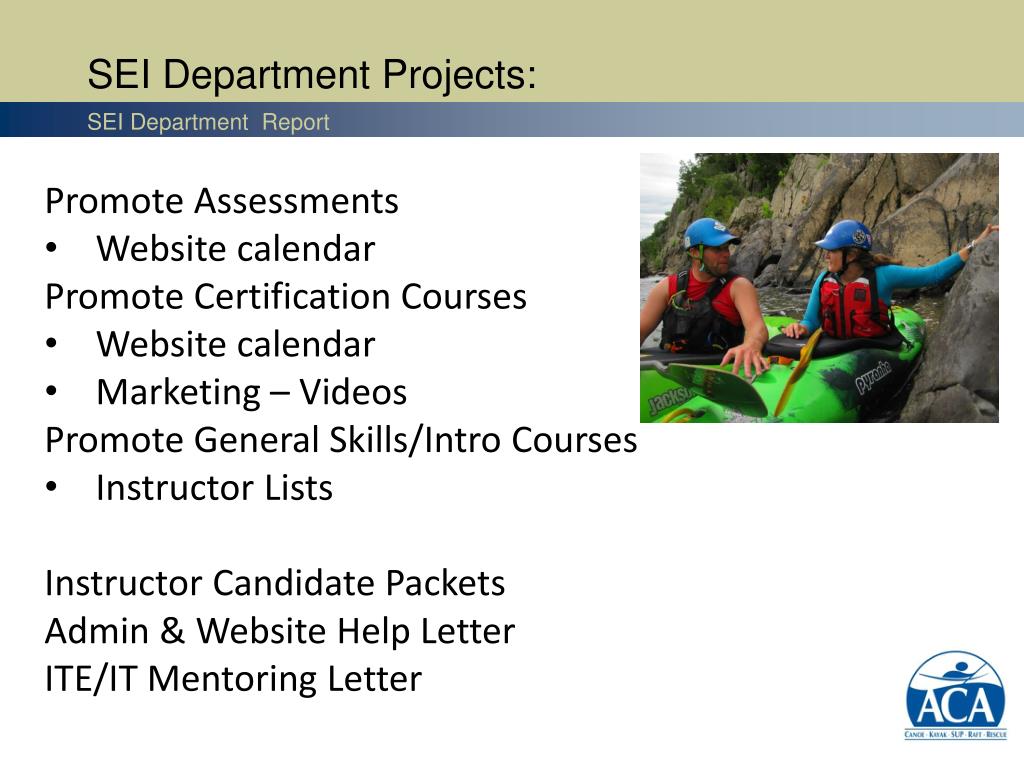 SEI Department Projects: SEI Department Report • Promote Assessments • Website calendar • Promote Certification Courses • Website calendar • Marketing – Videos • Promote General Skills/Intro Courses • Instructor Lists • Instructor Candidate Packets • Admin & Website Help Letter • ITE/IT Mentoring Letter