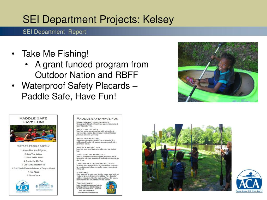 SEI Department Projects: Kelsey SEI Department Report • Take Me Fishing! • A grant funded program from Outdoor Nation and RBFF • Waterproof Safety Placards – Paddle Safe, Have Fun!