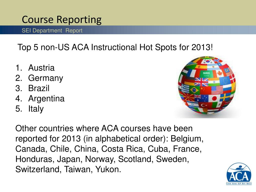 Course Reporting SEI Department Report • Top 5 non-US ACA Instructional Hot Spots for 2013! • Austria • Germany • Brazil • Argentina • Italy Other countries where ACA courses have been reported for 2013 (in alphabetical order): Belgium, Canada, Chile, China, Costa Rica, Cuba, France, Honduras, Japan, Norway, Scotland, Sweden, Switzerland, Taiwan, Yukon.