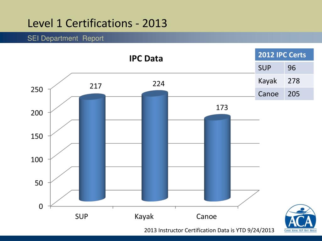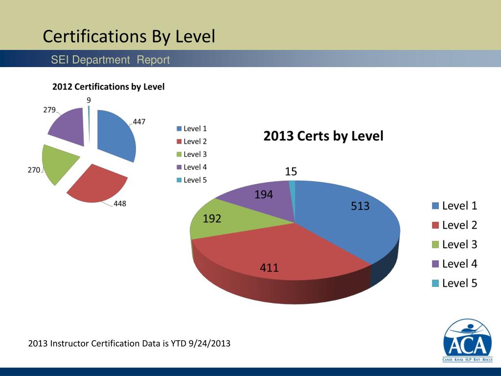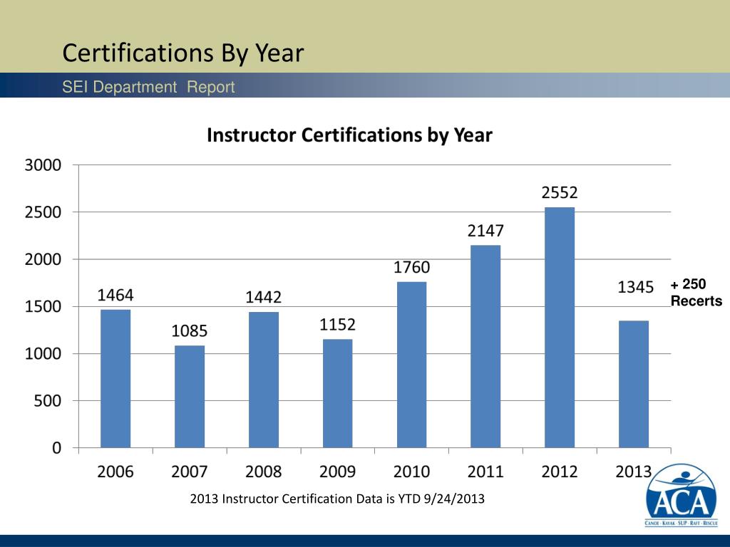 2013 Certifications by Month SEI Department Report *Note: Oct/Nov/Dec certs are TBD, and Sept cert courses reports are on hold until NPC concludes. It is my belief that there are still numerous July/Aug/Sept certification course reports yet to be reported to the ACA office.