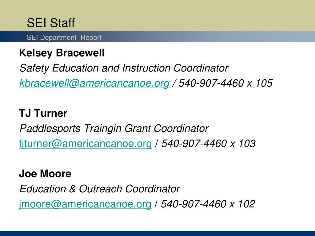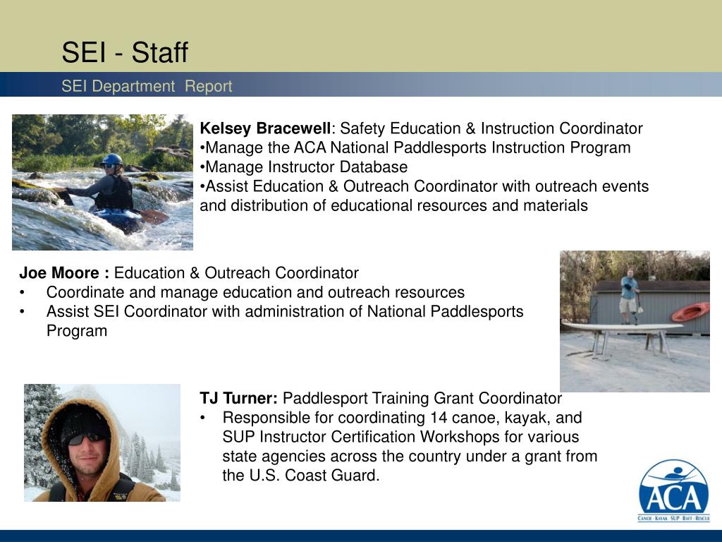 SEI - Staff SEI Department Report • Kelsey Bracewell: Safety Education & Instruction Coordinator • Manage the ACA National Paddlesports Instruction Program • Manage Instructor Database • Assist Education & Outreach Coordinator with outreach events and distribution of educational resources and materials • Joe Moore : Education & Outreach Coordinator • Coordinate and manage education and outreach resources • Assist SEI Coordinator with administration of National Paddlesports Program • TJ Turner: Paddlesport Training Grant Coordinator • Responsible for coordinating 14 canoe, kayak, and SUP Instructor Certification Workshops for various state agencies across the country under a grant from the U.S. Coast Guard.