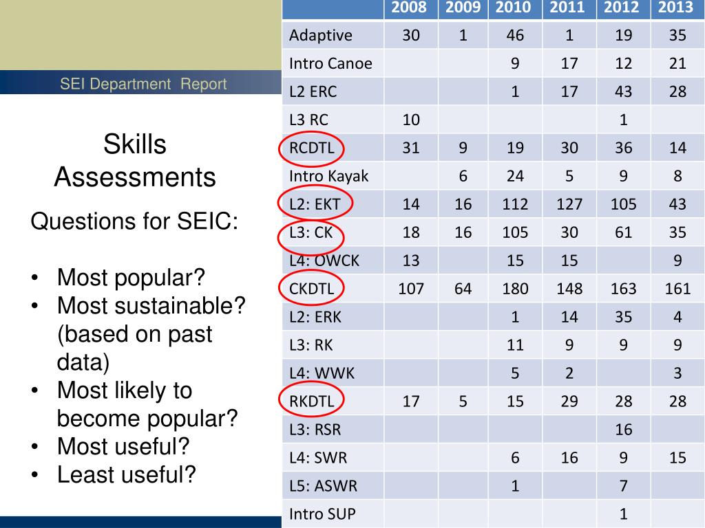SEI Department Report Skills Assessments • Questions for SEIC: • Most popular? • Most sustainable? (based on past data) • Most likely to become popular? • Most useful? • Least useful?