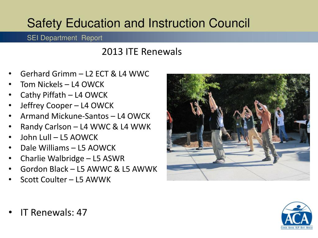 Safety Education and Instruction Council SEI Department Report • 2013 ITE Renewals • Gerhard Grimm – L2 ECT & L4 WWC • Tom Nickels – L4 OWCK • Cathy Piffath – L4 OWCK • Jeffrey Cooper – L4 OWCK • Armand Mickune-Santos – L4 OWCK • Randy Carlson – L4 WWC & L4 WWK • John Lull – L5 AOWCK • Dale Williams – L5 AOWCK • Charlie Walbridge – L5 ASWR • Gordon Black – L5 AWWC & L5 AWWK • Scott Coulter – L5 AWWK • IT Renewals: 47