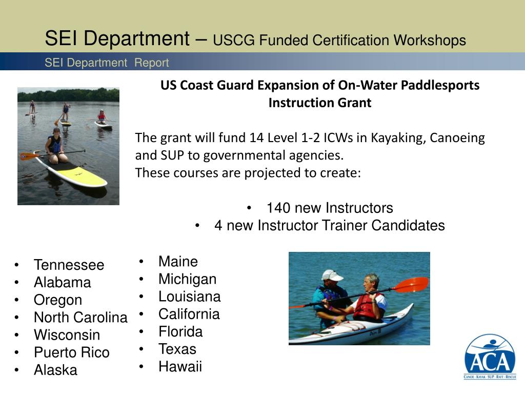 SEI Department – USCG Funded Certification Workshops SEI Department Report • US Coast Guard Expansion of On-Water Paddlesports Instruction Grant • The grant will fund 14 Level 1-2 ICWs in Kayaking, Canoeing and SUP to governmental agencies. • These courses are projected to create: • 140 new Instructors • 4 new Instructor Trainer Candidates • Tennessee • Alabama • Oregon • North Carolina • Wisconsin • Puerto Rico • Alaska • Maine • Michigan • Louisiana • California • Florida • Texas • Hawaii