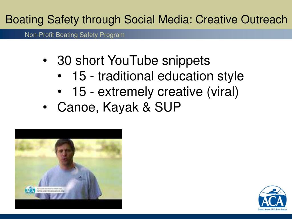 Boating Safety through Social Media: Creative Outreach Non-Profit Boating Safety Program • 30 short YouTube snippets • 15 - traditional education style • 15 - extremely creative (viral) • Canoe, Kayak & SUP
