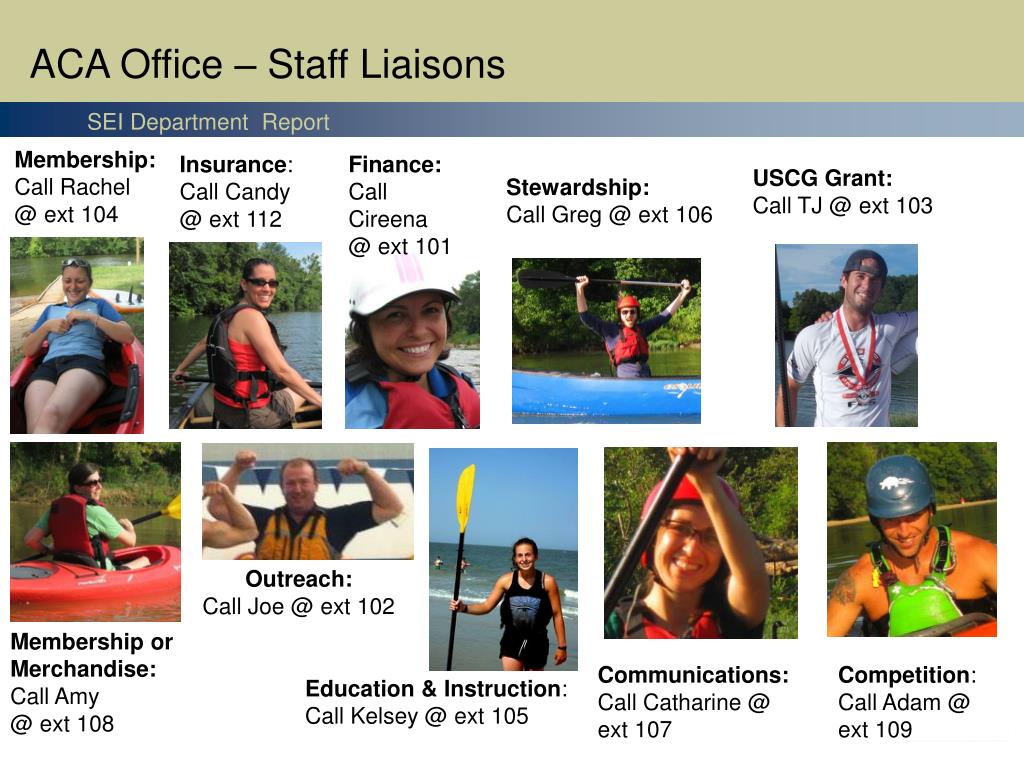 ACA Office – Staff Liaisons SEI Department Report Membership: Call Rachel @ ext 104 Insurance: Call Candy @ ext 112 Finance: Call Cireena @ ext 101 USCG Grant: Call TJ @ ext 103 Stewardship: Call Greg @ ext 106 Outreach: Call Joe @ ext 102 Membership or Merchandise: Call Amy @ ext 108 Communications: Call Catharine @ ext 107 Competition: Call Adam @ ext 109 Education & Instruction: Call Kelsey @ ext 105