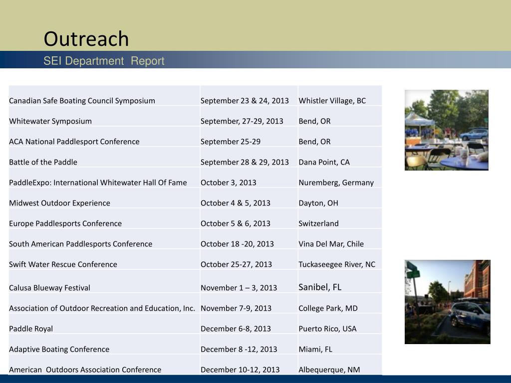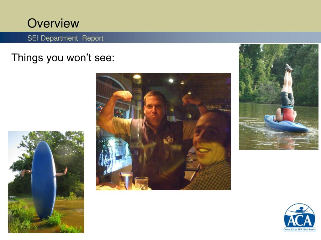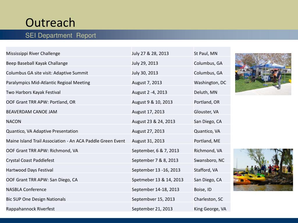 Overview SEI Department Report • Things you will see: • 2013 Outreach • Adaptive Paddling Program Development • Journal of Paddlesport Education • SEI Statistics • Grants/Projects • “Who You Gonna Call?”