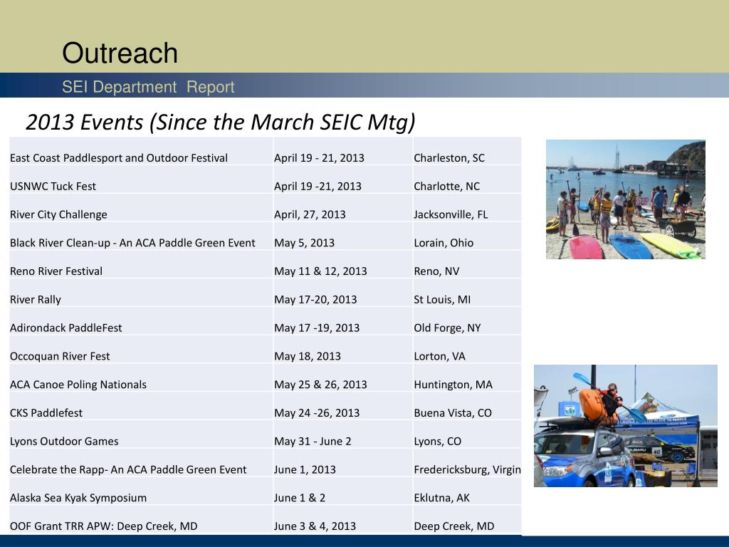 Outreach SEI Department Report 2013 Events (Since the March SEIC Mtg)