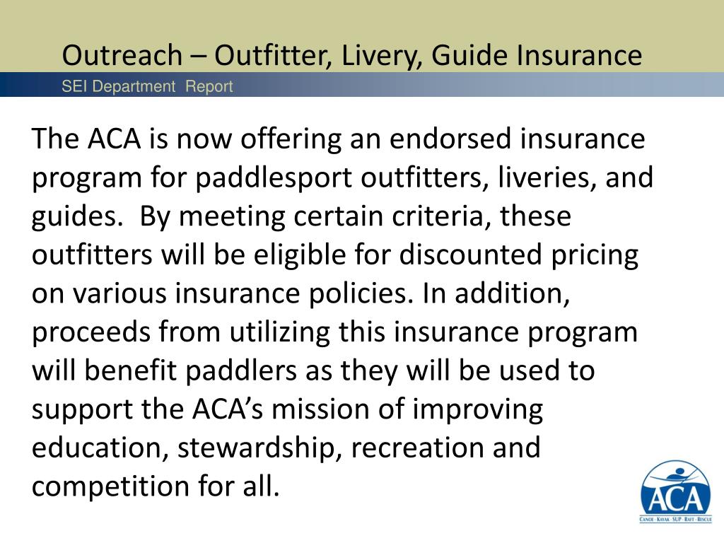 Outreach – Outfitter, Livery, Guide Insurance SEI Department Report The ACA is now offering an endorsed insurance program for paddlesport outfitters, liveries, and guides. By meeting certain criteria, these outfitters will be eligible for discounted pricing on various insurance policies. In addition, proceeds from utilizing this insurance program will benefit paddlers as they will be used to support the ACA’s mission of improving education, stewardship, recreation and competition for all.