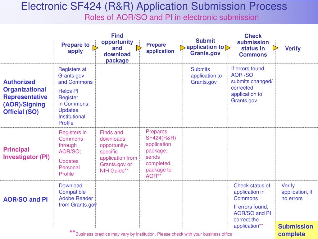 Electronic SF424 (R&R) Application Submission Process Roles ofAOR/SO and PI in electronic submission Find opportunity and download package Check submission status in Commons Submit application to Grants.gov Prepare application Verify Prepare to apply If errors found, AOR /SO submits changed/ corrected application to Grants.gov Registers at Grants.gov and Commons Submits application to Grants.gov Authorized Organizational Representative (AOR)/Signing Official (SO) Helps PI Register in Commons; Updates Institutional Profile Registers in Commons through AOR/SO; Updates Personal Profile Finds and downloads opportunity- specific application from Grants.gov or NIH Guide** Prepares SF424(R&R) application package; sends completed package to AOR** Principal Investigator (PI) Download Compatible Adobe Reader from Grants.gov Check status of application in Commons Verify application, if no errors AOR/SO and PI If errors found, AOR/SO and PI correct the application** Submission complete **Businesspractice may vary by institution. Please check with your business office