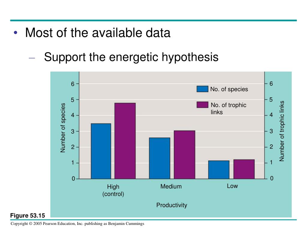 6 6 No. of species 5 5 No. of trophic links 4 4 Number of species Number of trophic links 3 3 2 2 1 1 0 0 Low Medium High (control) Productivity Figure 53.15 • Most of the available data • Support the energetic hypothesis