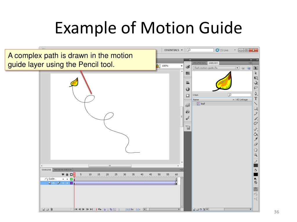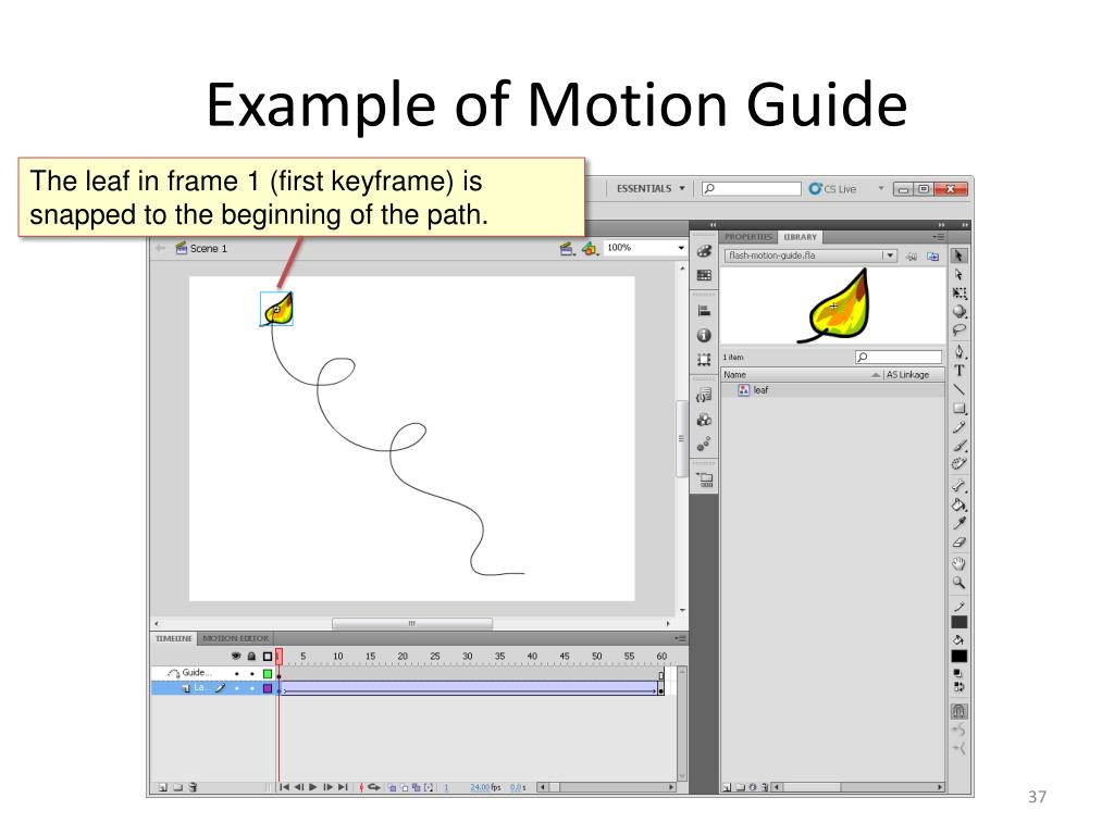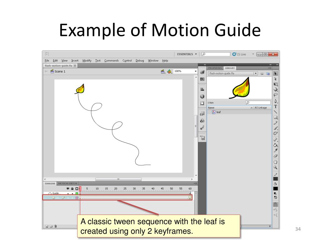 Example of Motion Guide A classic tween sequence with the leaf is created using only 2 keyframes.
