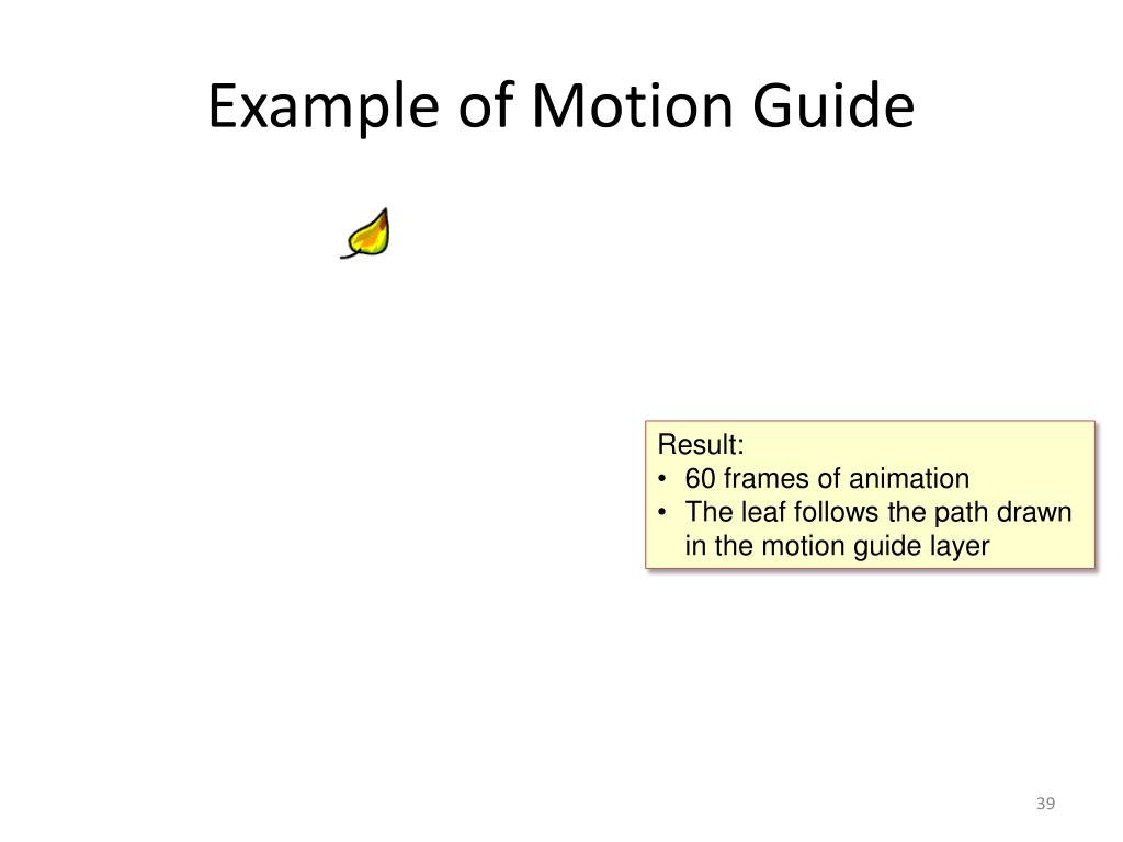 Example of Motion Guide • Result: • 60 frames of animation • The leaf follows the path drawn in the motion guide layer