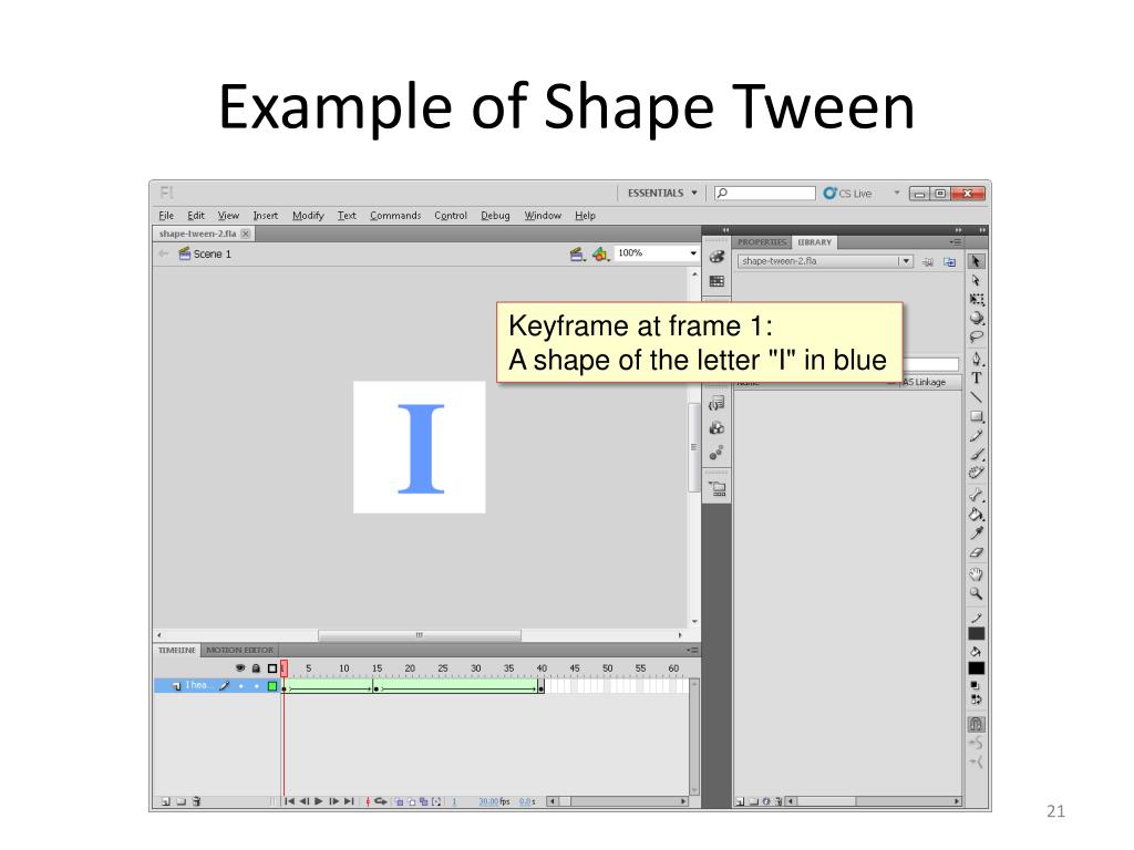 Example of Shape Tween Keyframe at frame 1: A shape of the letter "I" in blue