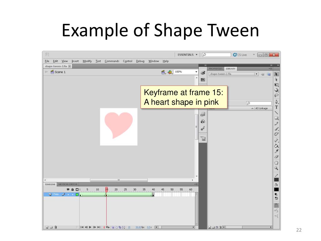 Example of Shape Tween Keyframe at frame 15: A heart shape in pink