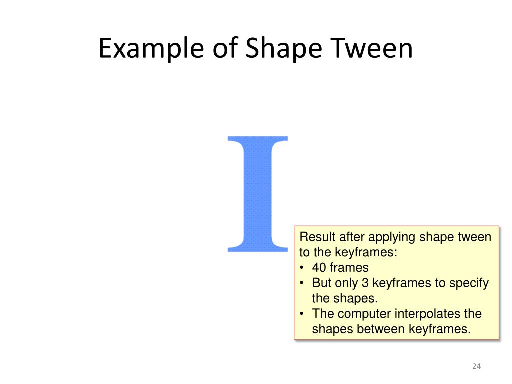 Example of Shape Tween • Result after applying shape tween to the keyframes: • 40 frames • But only 3 keyframes to specify the shapes. • The computer interpolates the shapes between keyframes.