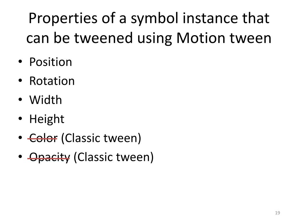 Properties of a symbol instance that can be tweened using Motion tween • Position • Rotation • Width • Height • Color (Classic tween) • Opacity (Classic tween)