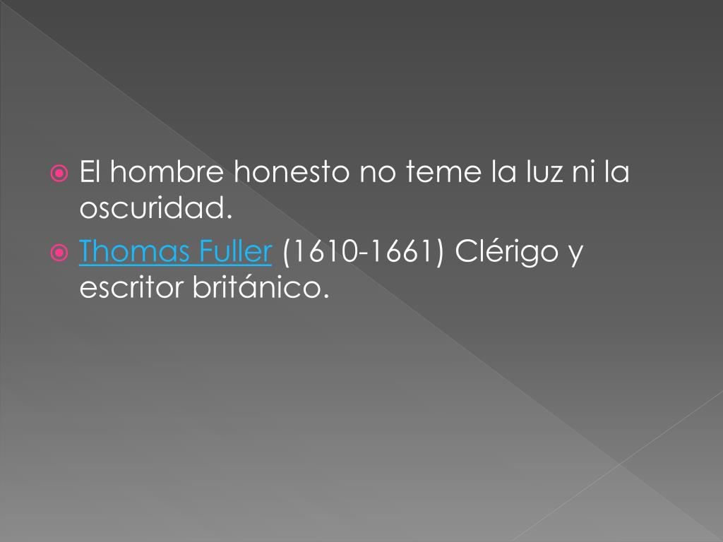 El hombre honesto no teme la luz ni la oscuridad. • Thomas Fuller (1610-1661) Clérigo y escritor británico.