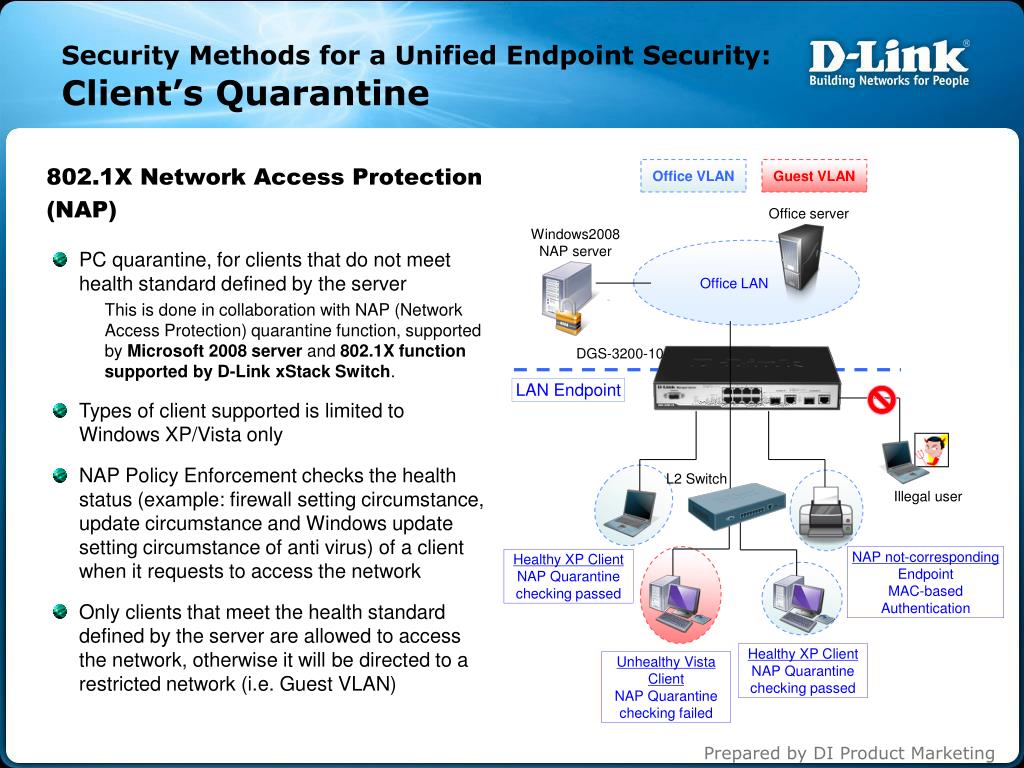 Unified Endpoint Security Solution. D-Link International , February 2008. Agenda. Products’ P ortfolio Application Awards Traditional Security v s . “End-point” Security Unified “End-point” Security Security Method: User Certification Client’s Quarantine Access Control.