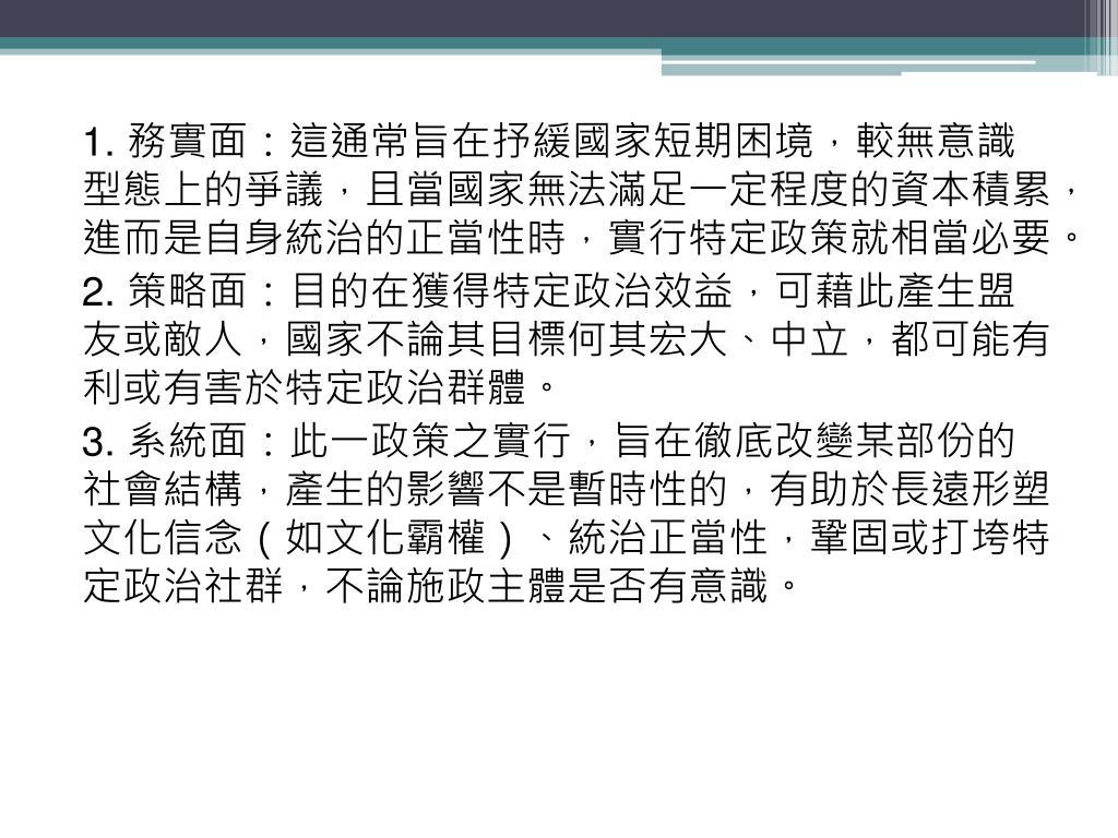 1. 務實面:這通常旨在抒緩國家短期困境,較無意識型態上的爭議,且當國家無法滿足一定程度的資本積累,進而是自身統治的正當性時,實行特定政策就相當必要。 2. 策略面:目的在獲得特定政治效益,可藉此產生盟友或敵人,國家不論其目標何其宏大、中立,都可能有利或有害於特定政治群體。 3. 系統面:此一政策之實行,旨在徹底改變某部份的社會結構,產生的影響不是暫時性的,有助於長遠形塑文化信念(如文化霸權)、統治正當性,鞏固或打垮特定政治社群,不論施政主體是否有意識。