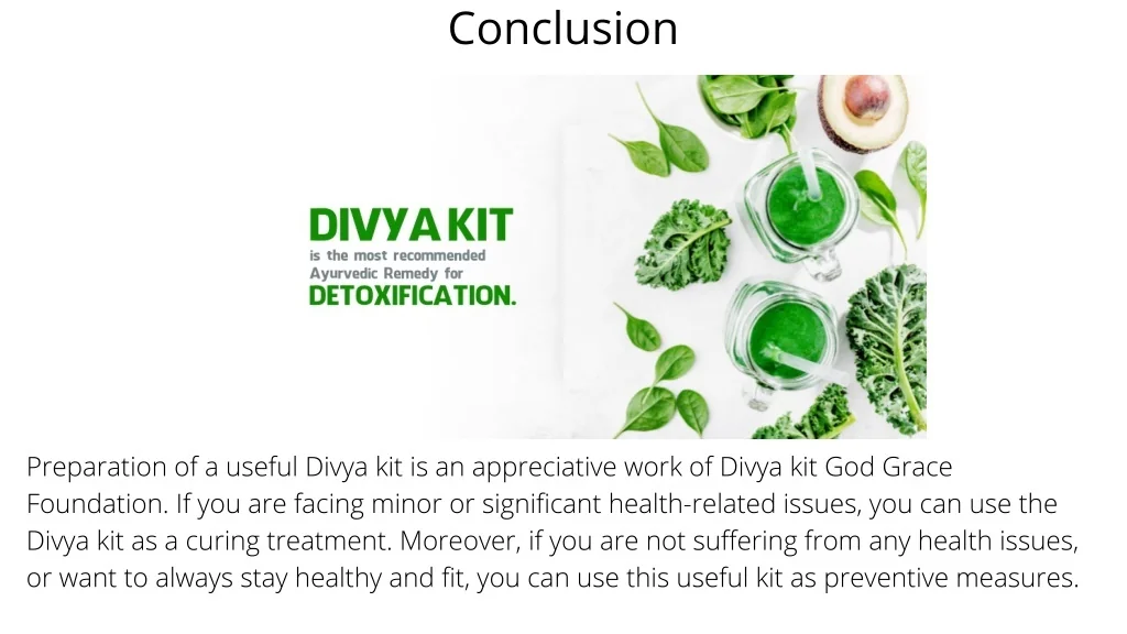 Conclusion Preparation of a useful Divya kit is an appreciative work of Divya kit God Grace Foundation. If you are facing minor or significant health-related issues, you can use the Divya kit as a curing treatment. Moreover, if you are not suffering from any health issues, or want to always stay healthy and fit, you can use this useful kit as preventive measures.