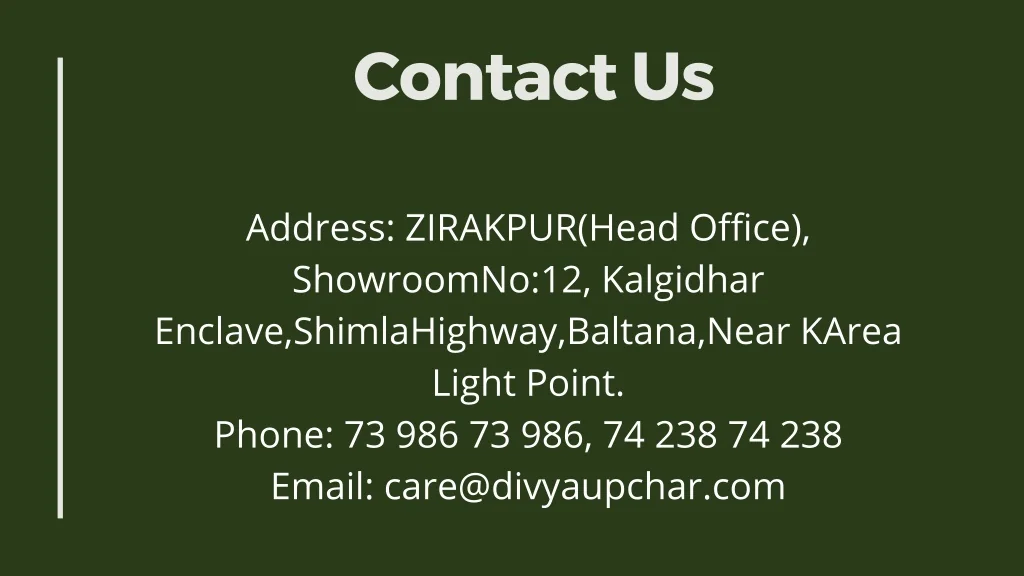 Contact Us Address: ZIRAKPUR(Head Office), ShowroomNo:12, Kalgidhar Enclave,ShimlaHighway,Baltana,Near KArea Light Point. Phone: 73 986 73 986, 74 238 74 238 Email: care@divyaupchar.com