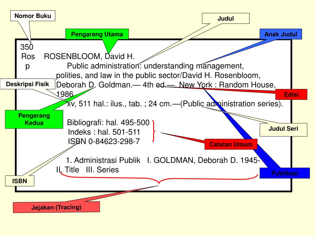 Nomor Buku Judul Pengarang Utama Anak Judul 350 Ros ROSENBLOOM, David H. p Public administration: understanding management, polities, and law in the public sector/David H. Rosenbloom, Deborah D.Goldman.— 4th ed.—. New York : Random House, 1986. xv, 511 hal.: ilus., tab. ; 24 cm.—(Public administration series). Bibliografi: hal. 495-500 Indeks : hal. 501-511 ISBN 0-84623-298-7 1. Administrasi Publik I. GOLDMAN, Deborah D. 1945- II. Title III. Series Deskripsi Fisik Edisi Pengerang Kedua Judul Seri Catatan Umum Publikasi ISBN Jejakan (Tracing)