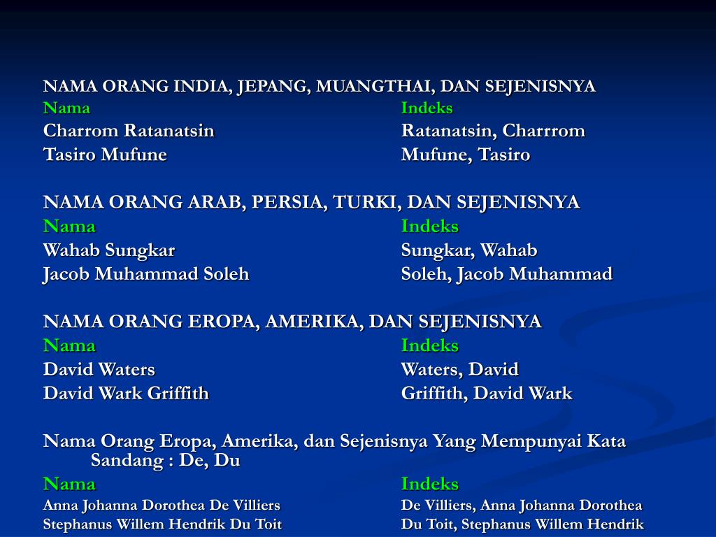 NAMA ORANG INDIA, JEPANG, MUANGTHAI, DAN SEJENISNYA Nama Indeks Charrom Ratanatsin Ratanatsin, Charrrom Tasiro Mufune Mufune, Tasiro NAMA ORANG ARAB, PERSIA, TURKI, DAN SEJENISNYA Nama Indeks Wahab Sungkar Sungkar, Wahab Jacob Muhammad Soleh Soleh, Jacob Muhammad NAMA ORANG EROPA, AMERIKA, DAN SEJENISNYA Nama Indeks David Waters Waters, David David Wark Griffith Griffith, David Wark Nama Orang Eropa, Amerika, dan Sejenisnya Yang Mempunyai Kata Sandang : De, Du Nama Indeks Anna Johanna Dorothea De Villiers De Villiers, Anna Johanna Dorothea Stephanus Willem Hendrik Du Toit Du Toit, Stephanus Willem Hendrik