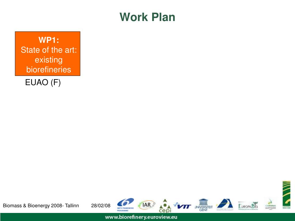 Work Plan WP2:State of the art:socio-economic impacting factors WP1:State of the art:existing biorefineries WP3:Scenarios for development of biorefineries WP5:Coordination and Dissemination Website Brochure Poster Newsletters Press Biorefinery Conferences EUAO (F) UGENT (BE) RDANGP (HU) Relevant scenarios including technological process, resource avaibility, industrial organization and facilities views Opportunities and limits for the development of biorefineries WP4:Impacting of the selected scenariosRecommendations for best practice IAR (F) VTT (FI)