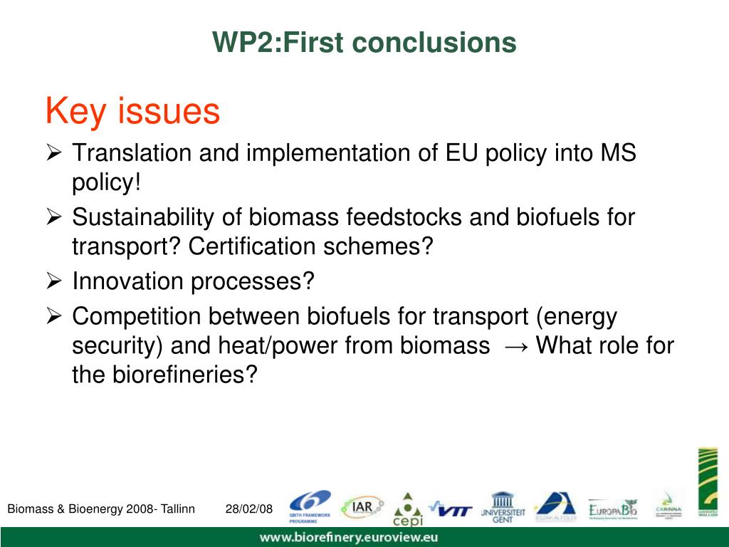 WP2:First conclusions Key issues • Translation and implementation of EU policy into MS policy! • Sustainability of biomass feedstocks and biofuels for transport? Certification schemes? • Innovation processes? • Competition between biofuels for transport (energy security) and heat/power from biomass → What role for the biorefineries?