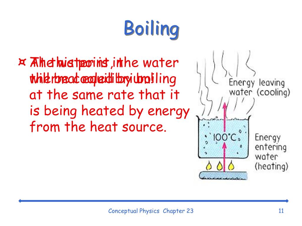 Boiling • At this point, the water will be cooled by boiling at the same rate that it is being heated by energy from the heat source. • The water is in thermal equilibrium! Conceptual Physics Chapter 23
