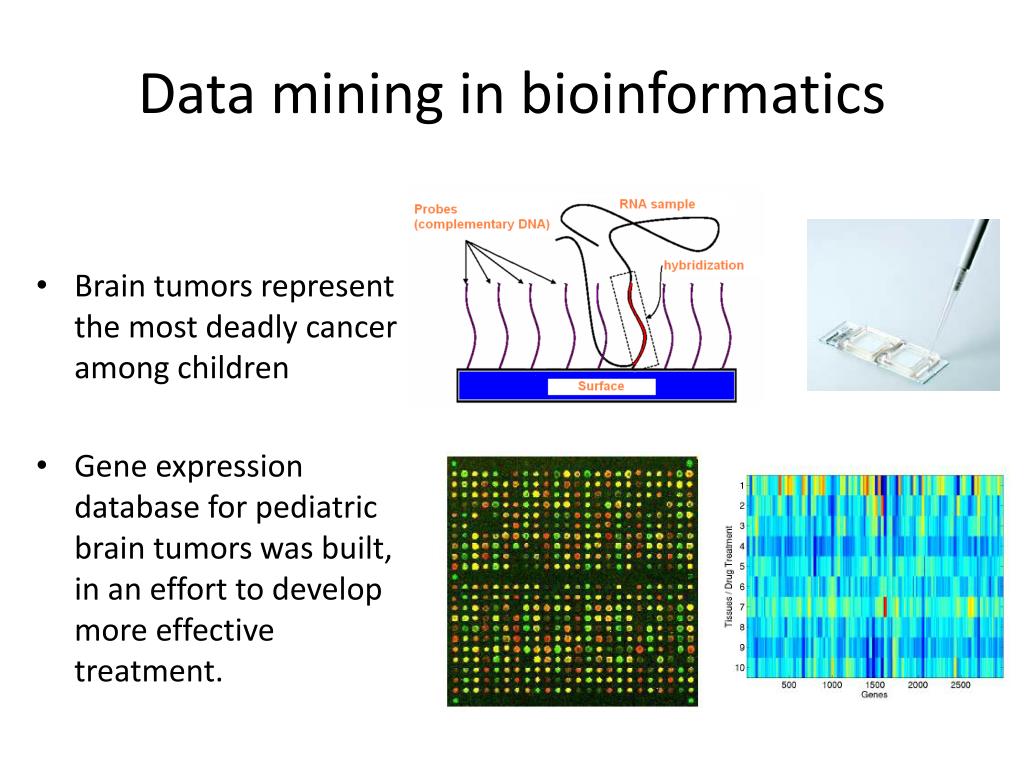 Data mining in bioinformatics • Brain tumors represent the most deadly cancer among children • Gene expression database for pediatric brain tumors was built, in an effort to develop more effective treatment.