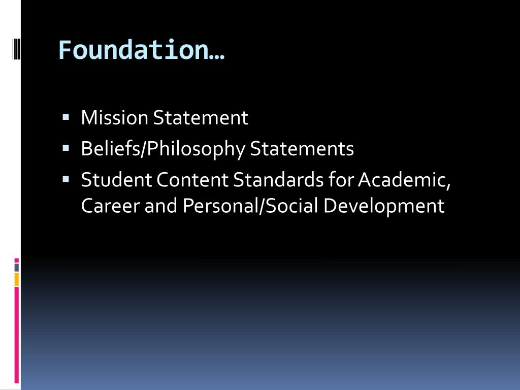 Foundation… • Mission Statement • Beliefs/Philosophy Statements • Student Content Standards for Academic, Career and Personal/Social Development