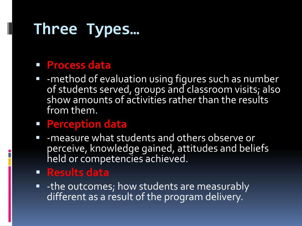 Three Types… • Process data • -method of evaluation using figures such as number of students served, groups and classroom visits; also show amounts of activities rather than the results from them. • Perception data • -measure what students and others observe or perceive, knowledge gained, attitudes and beliefs held or competencies achieved. • Results data • -the outcomes; how students are measurably different as a result of the program delivery.
