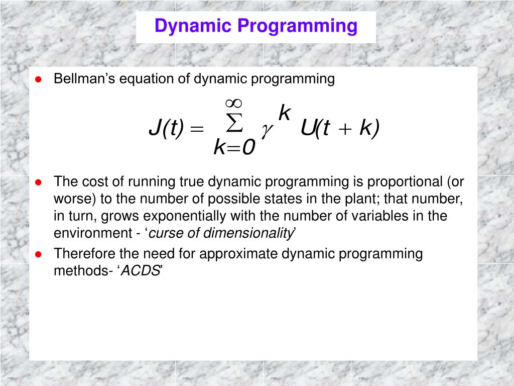 Bellman’s equation of dynamic programming The cost of running true dynamic programming is proportional (or worse) to the number of possible states in the plant; that number, in turn, grows exponentially with the number of variables in the environment - ‘curse of dimensionality’ Therefore the need for approximate dynamic programming methods- ‘ACDS’ Dynamic Programming