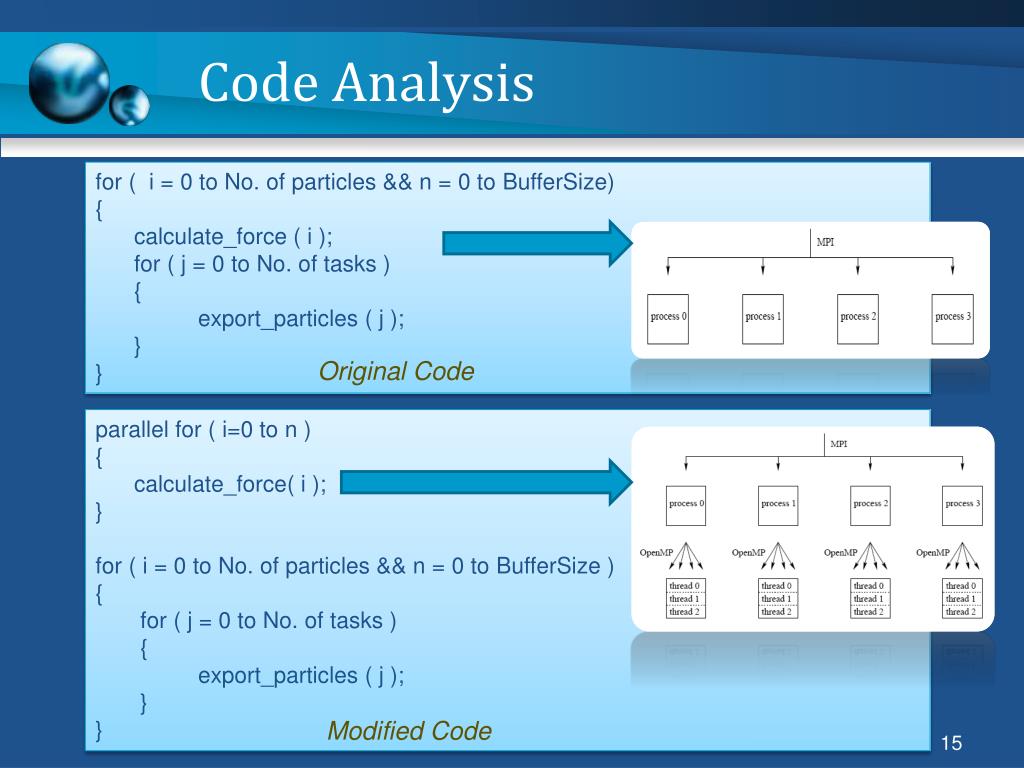 Code Analysis for ( i = 0 to No. of particles && n = 0 to BufferSize) { calculate_force( i ); for ( j = 0 to No. of tasks ) { export_particles( j ); } } Original Code parallel for ( i=0 to n ) { calculate_force( i ); } for (i = 0 to No. of particles && n = 0 to BufferSize ) { for ( j = 0 to No. of tasks ) { export_particles( j ); } } Modified Code