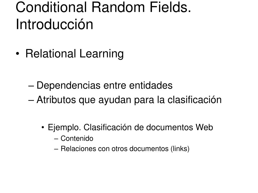 Conditional Random Fields. Introducción • Relational Learning • Dependencias entre entidades • Atributos que ayudan para la clasificación • Ejemplo. Clasificación de documentos Web • Contenido • Relaciones con otros documentos (links)