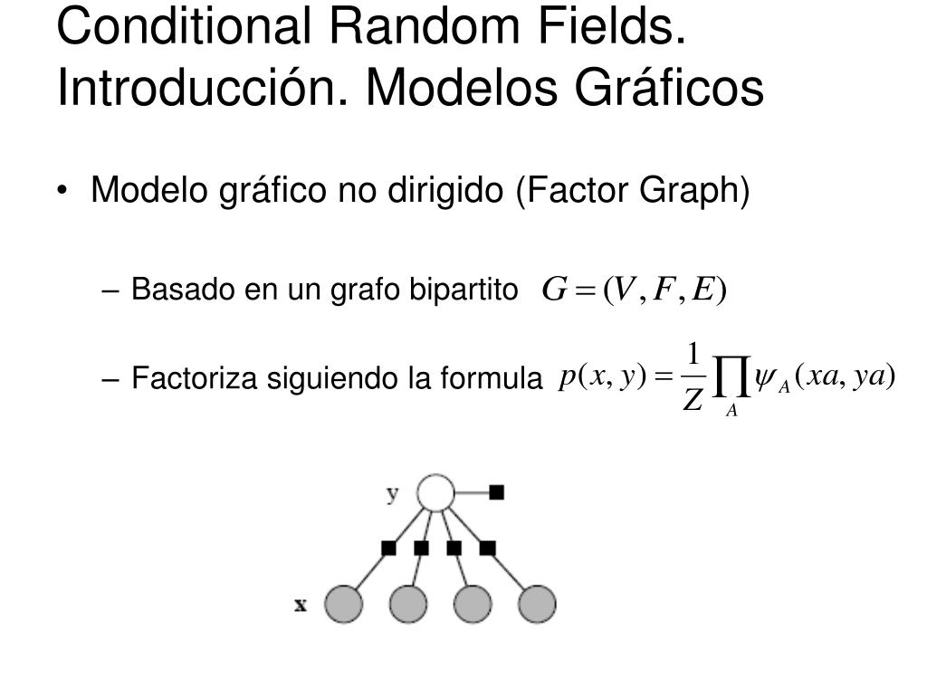 Conditional Random Fields. Introducción. Modelos Gráficos • Modelo gráfico no dirigido (Factor Graph) • Basado en un grafo bipartito • Factoriza siguiendo la formula