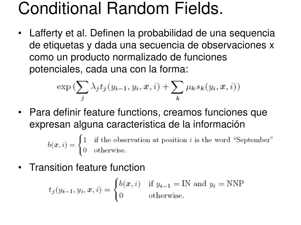 Conditional Random Fields. • Lafferty et al. Definen la probabilidad de una sequencia de etiquetas y dada una secuencia de observaciones x como un producto normalizado de funciones potenciales, cada una con la forma: • Para definir feature functions, creamos funciones que expresan alguna caracteristica de la información • Transition feature function