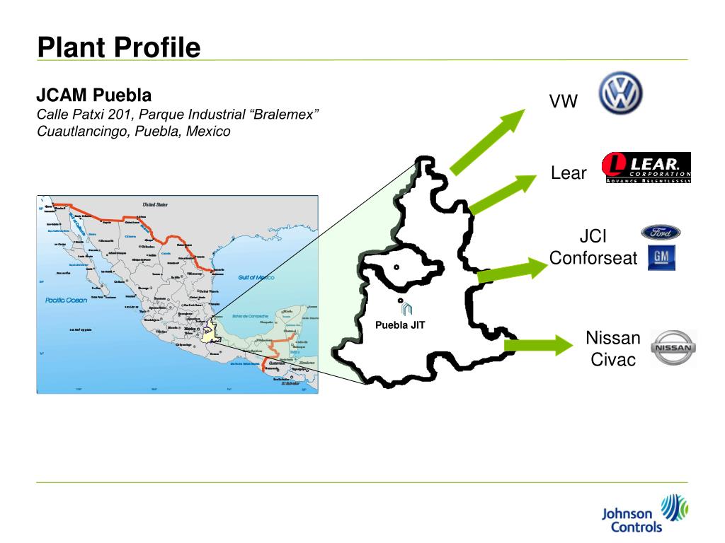 Plant Profile JCAM Puebla Calle Patxi 201, Parque Industrial “Bralemex” Cuautlancingo, Puebla, Mexico VW Lear JCI Conforseat Puebla JIT Nissan Civac