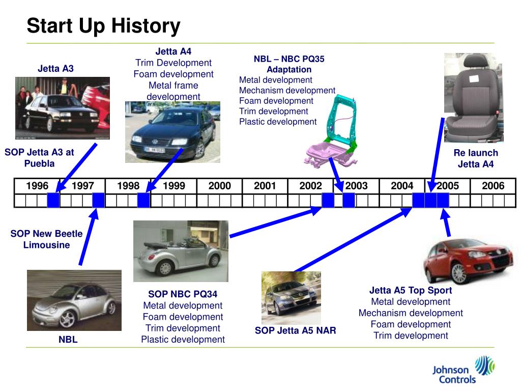 Start Up History Jetta A4 Trim Development Foam development Metal frame development NBL – NBC PQ35 Adaptation Metal development Mechanism development Foam development Trim development Plastic development Jetta A3 SOP Jetta A3 at Puebla Re launch Jetta A4 SOP New Beetle Limousine Jetta A5 Top Sport Metal development Mechanism development Foam development Trim development SOP NBC PQ34 Metal development Foam development Trim development Plastic development SOP Jetta A5 NAR NBL