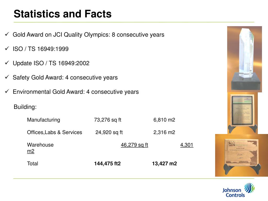 Statistics and Facts • Gold Award on JCI Quality Olympics: 8 consecutive years • ISO / TS 16949:1999 • Update ISO / TS 16949:2002 • Safety Gold Award: 4 consecutive years • Environmental Gold Award: 4 consecutive years • Building: • Manufacturing 73,276 sq ft 6,810 m2 • Offices,Labs & Services 24,920 sq ft 2,316 m2 • Warehouse 46,279 sq ft4,301 m2 • Total 144,475 ft2 13,427 m2