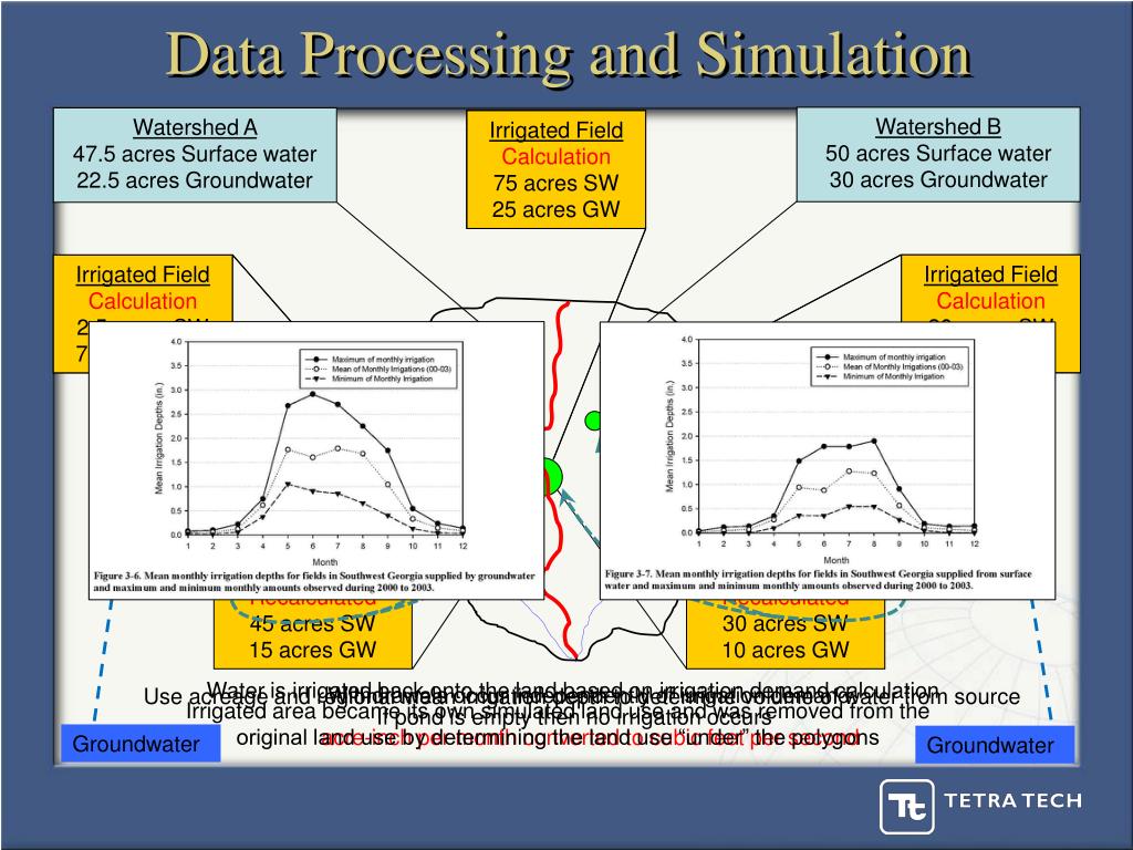 Data Processing and Simulation Watershed B 50 acres Surface water 30 acres Groundwater Watershed A 47.5 acres Surface water 22.5acres Groundwater Irrigated Field 100 acres 75% Surface 25% Ground Irrigated Field Calculation 75 acres SW 25 acres GW A B Irrigated Field Calculation 20 acres SW 20 acres GW Irrigated Field 10 acres 25% Surface 75% Ground Irrigated Field 40 acres 50% Surface 50% Ground Irrigated Field Calculation 2.5 acres SW 7.5 acres GW A B Split Field B 40% Recalculated 30 acres SW 10 acres GW Split Field A 60% Recalculated 45 acres SW 15 acres GW Use acreage and regional mean irrigation depth to determinevolume of water from source acre-inch per month converted to cubic feet per second Water is irrigated back onto the land based on irrigation demand calculation If pond is empty then no irrigation occurs Withdrawals occur independently of irrigation demand Irrigated area became its own simulated land use and was removed from the original land use by determining the land use “under” the polygons Groundwater Groundwater